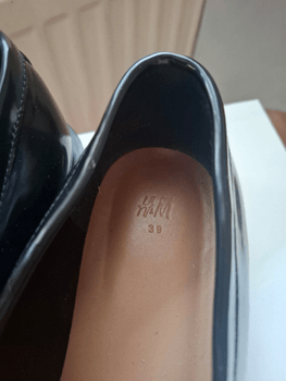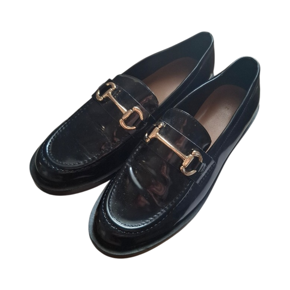 Women's black shiny loafers with a gold ornament, size 39. Good condition.