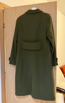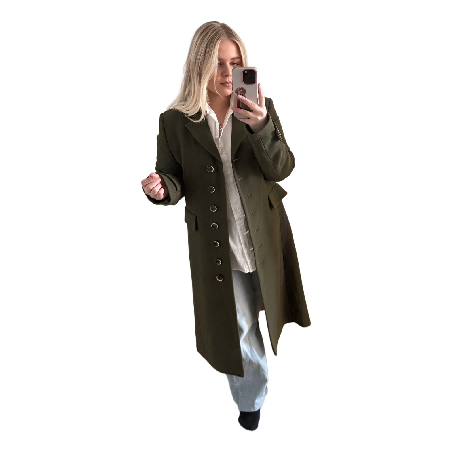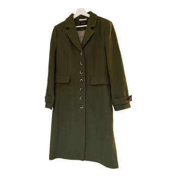 Long dark green coat with button-down front and tab sleeves. Features a structured collar and back waist detail.