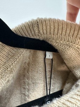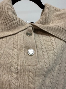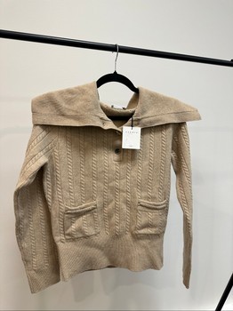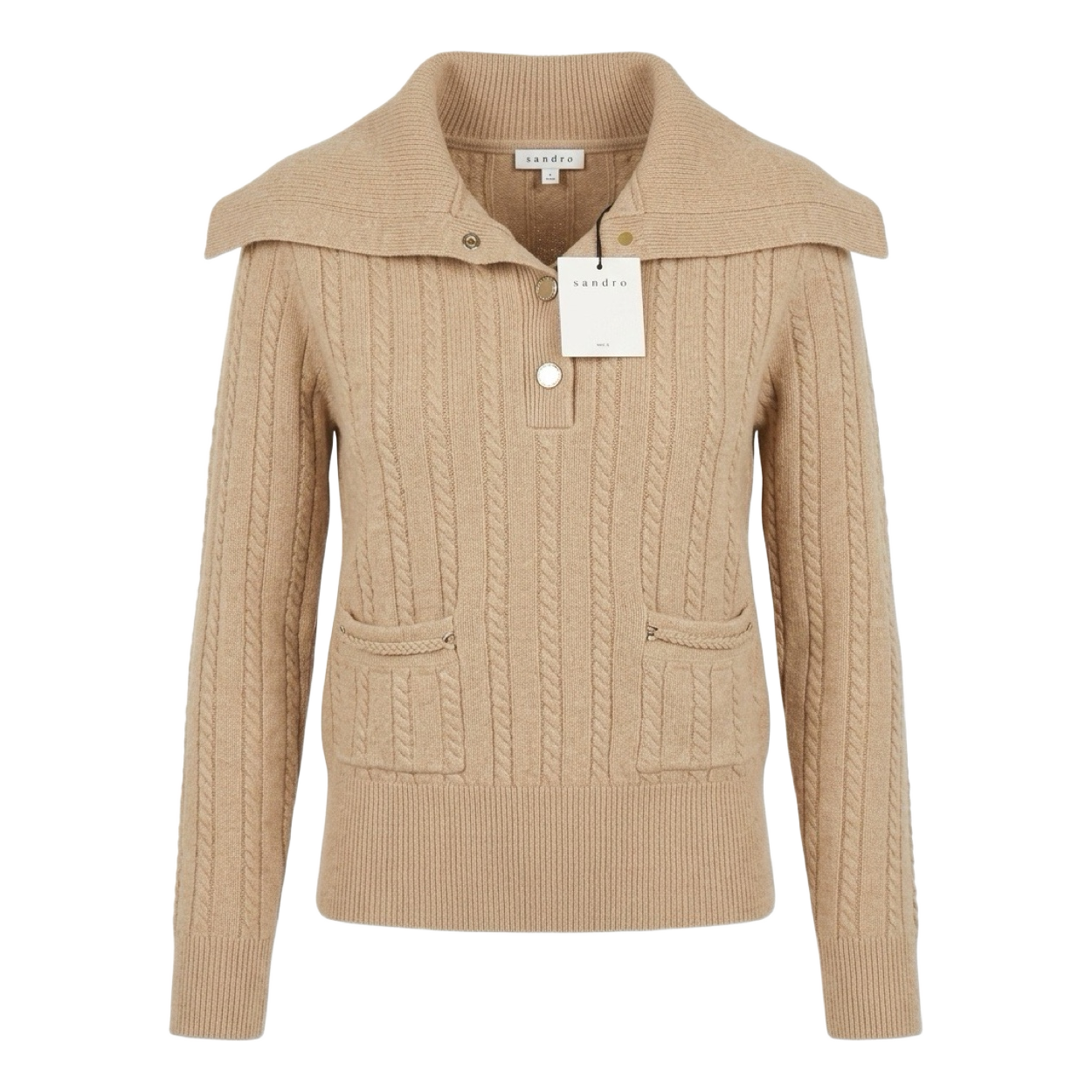 Beige cable knit sweater by Sandro with a wide collar and button placket. Features front pockets and long sleeves. Size 1.