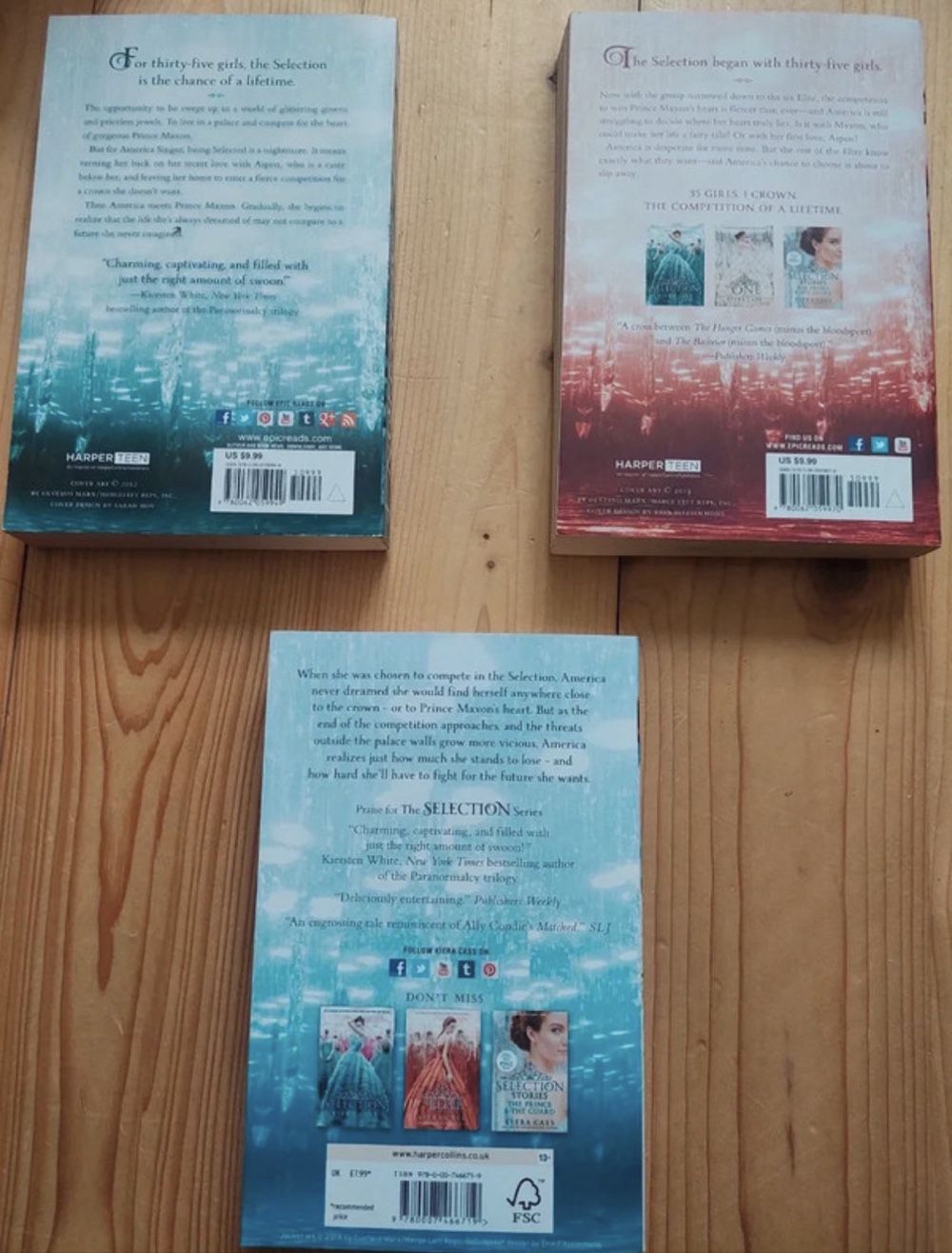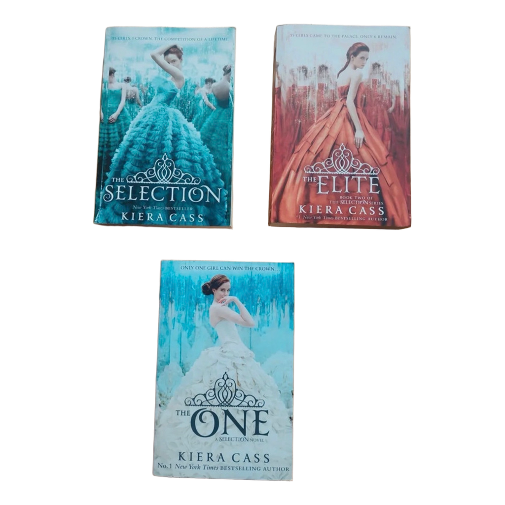 Three novels from The Selection series by Kiera Cass. Set includes The Selection, The Elite, and The One. Paperback format.