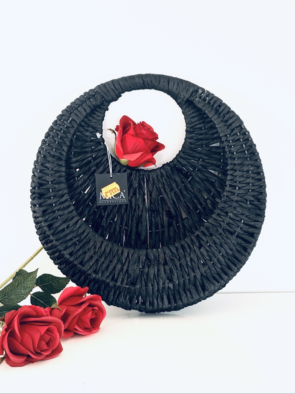 Round black woven wall decoration. The product is unused and it has a price tag.