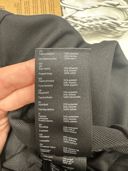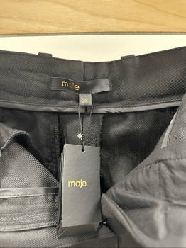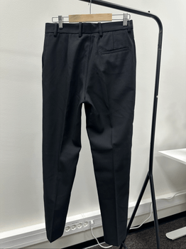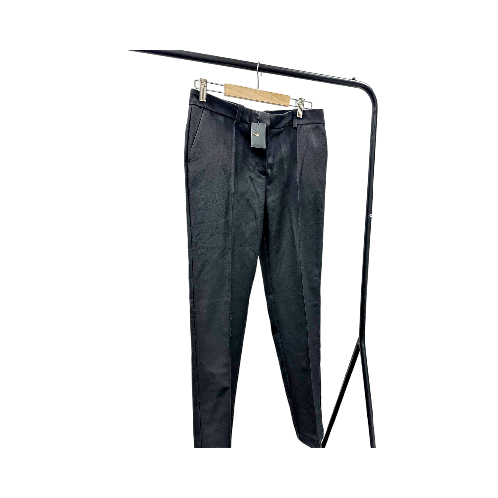 Stylish black tapered pants with front and back pockets. Features a label indicating size 36. Made of 70% polyester and 30% viscose.