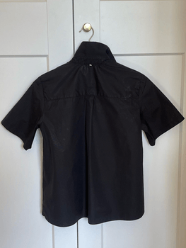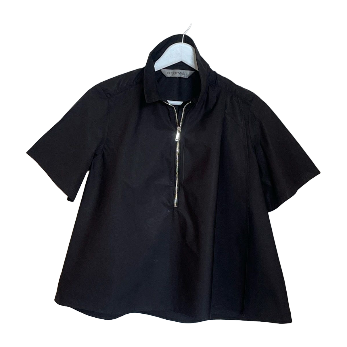 Sportmax poplin shirt with collar and statement zipper. At the nape (visible in the second photo) a small rhinestone. Front open, meaning the shirt is open from collar to hem (third photo). Airy and lightweight material, tags cut off and the size is, if I remember, S. Check the measurements to ensure fit.