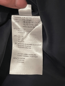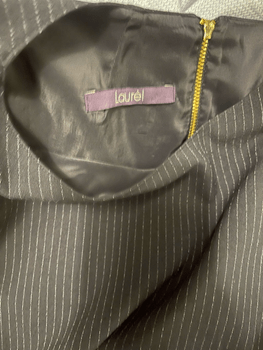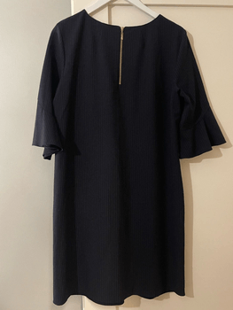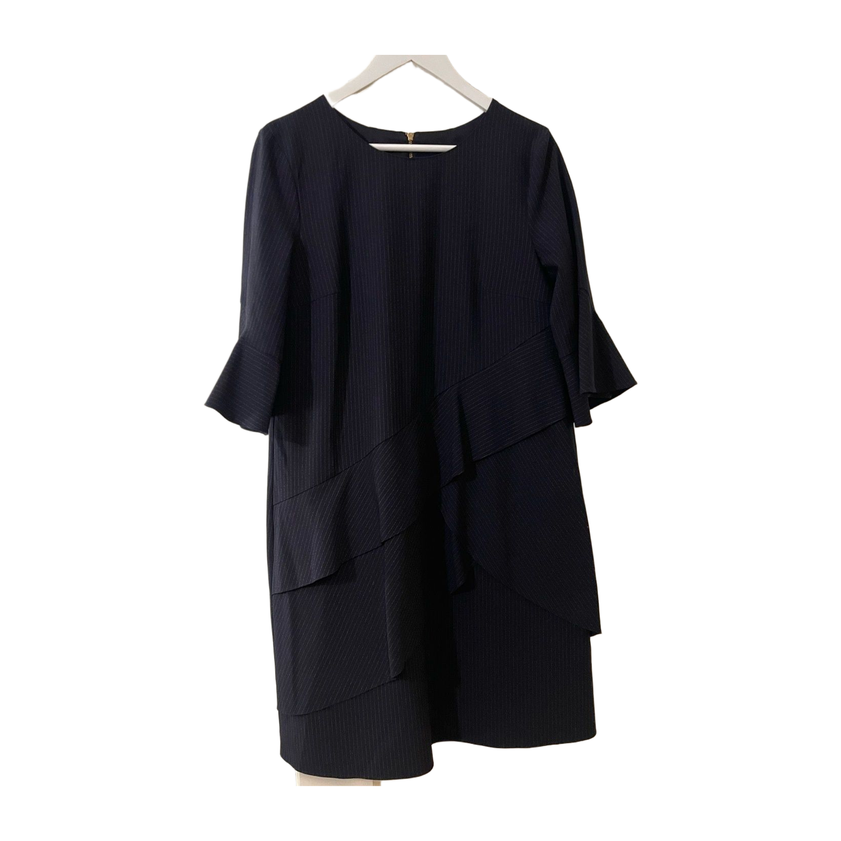 Laurelin dark blue pinstripe-patterned dress. Hem has peplum details and trumpet sleeves. Numeric size 38. Bust 49, Waist 48, Hip 55, Hem width 58, Shoulder-to-hem 90, Neck-to-hem 92, Shoulder width 42, Sleeve length 39.