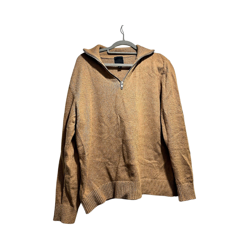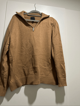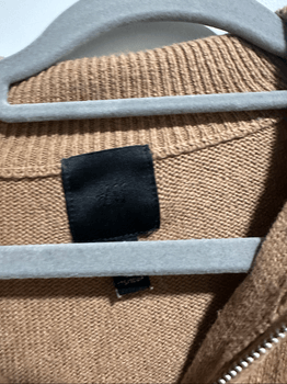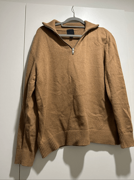 Beige sweater, zipper at front. Long-sleeved and wide neckline.