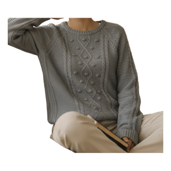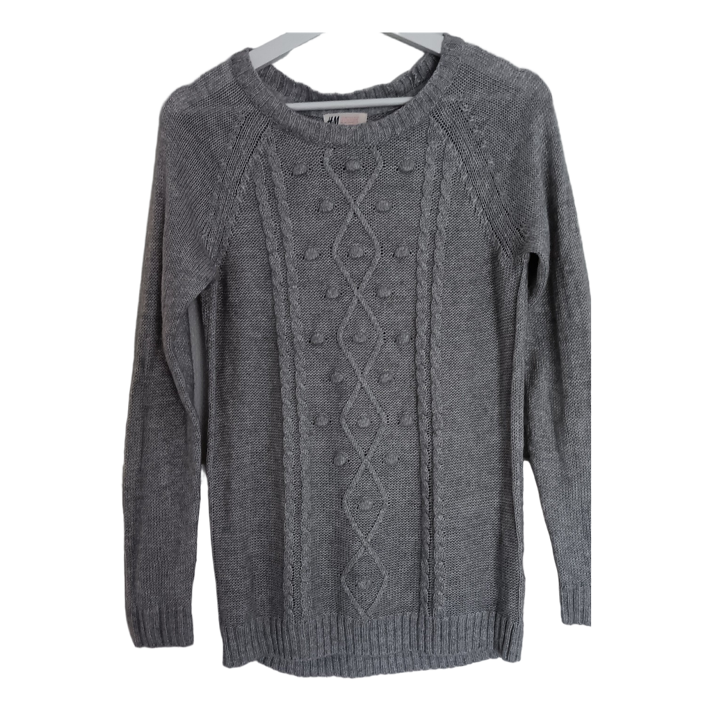Gray long-sleeved knit sweater with cable knit and bobble pattern. Size 146/152.