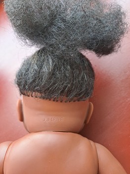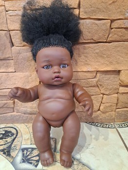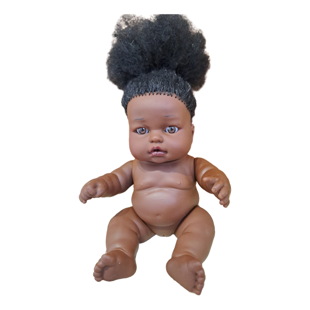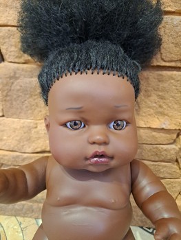 Vinyl baby doll with dark complexion and curly black hair. ŪFeaturing brown eyes and detailed facial features.