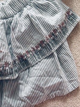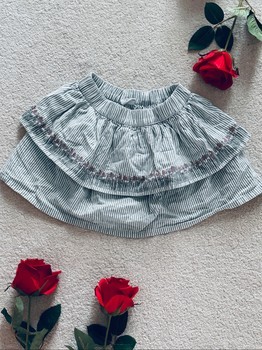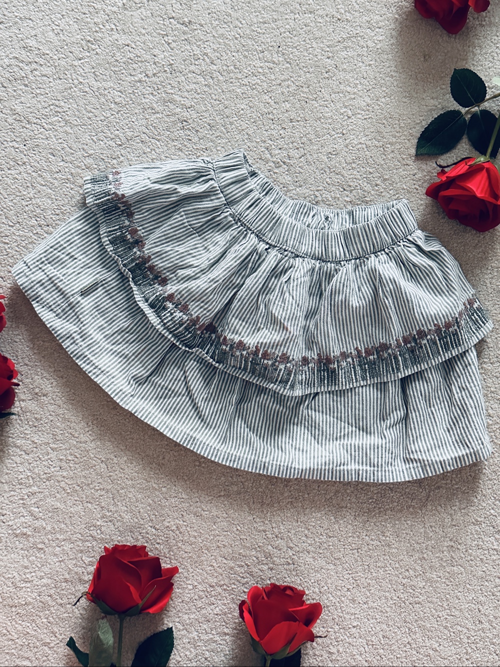 Grey striped skirt with a floral embroidered detail. Elastic waistband.