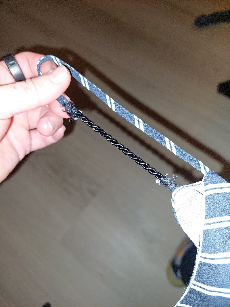 Navy and white striped lightweight sleeveless camisole top. Some layering, spaghetti strap DIY extended with black twisted cord.
