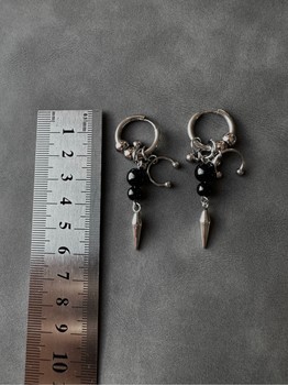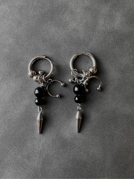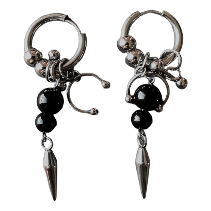 Silver tone hoop earrings with dangling black beads and spike pendants.