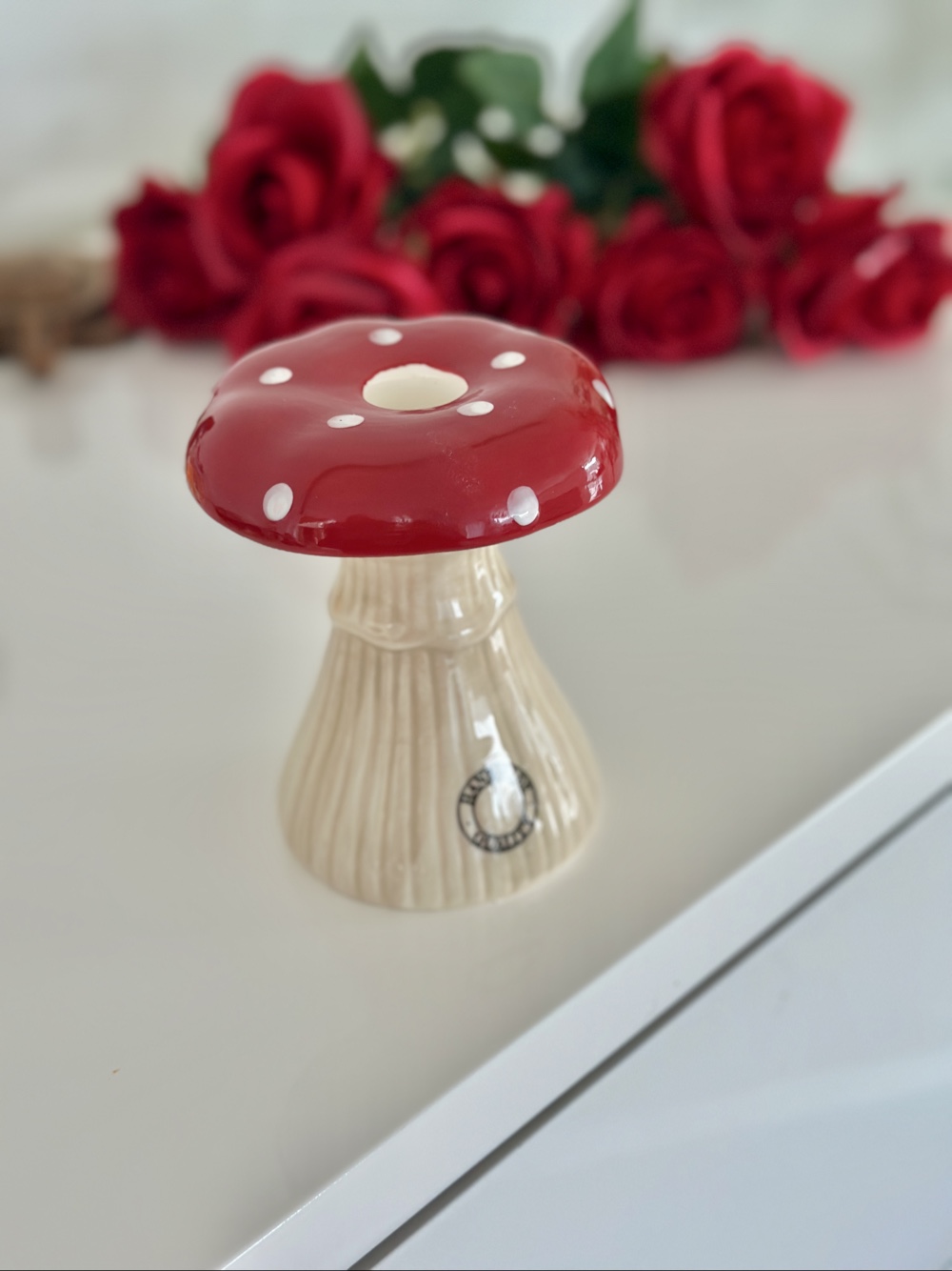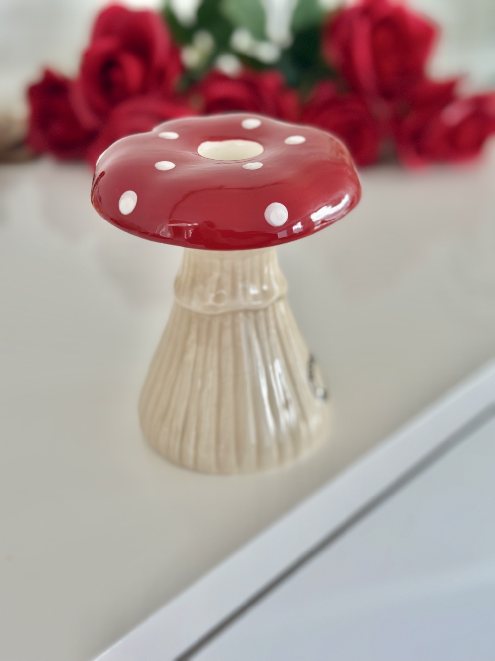 Red-white ceramic mushroom candlestick. On top a place for one candle.