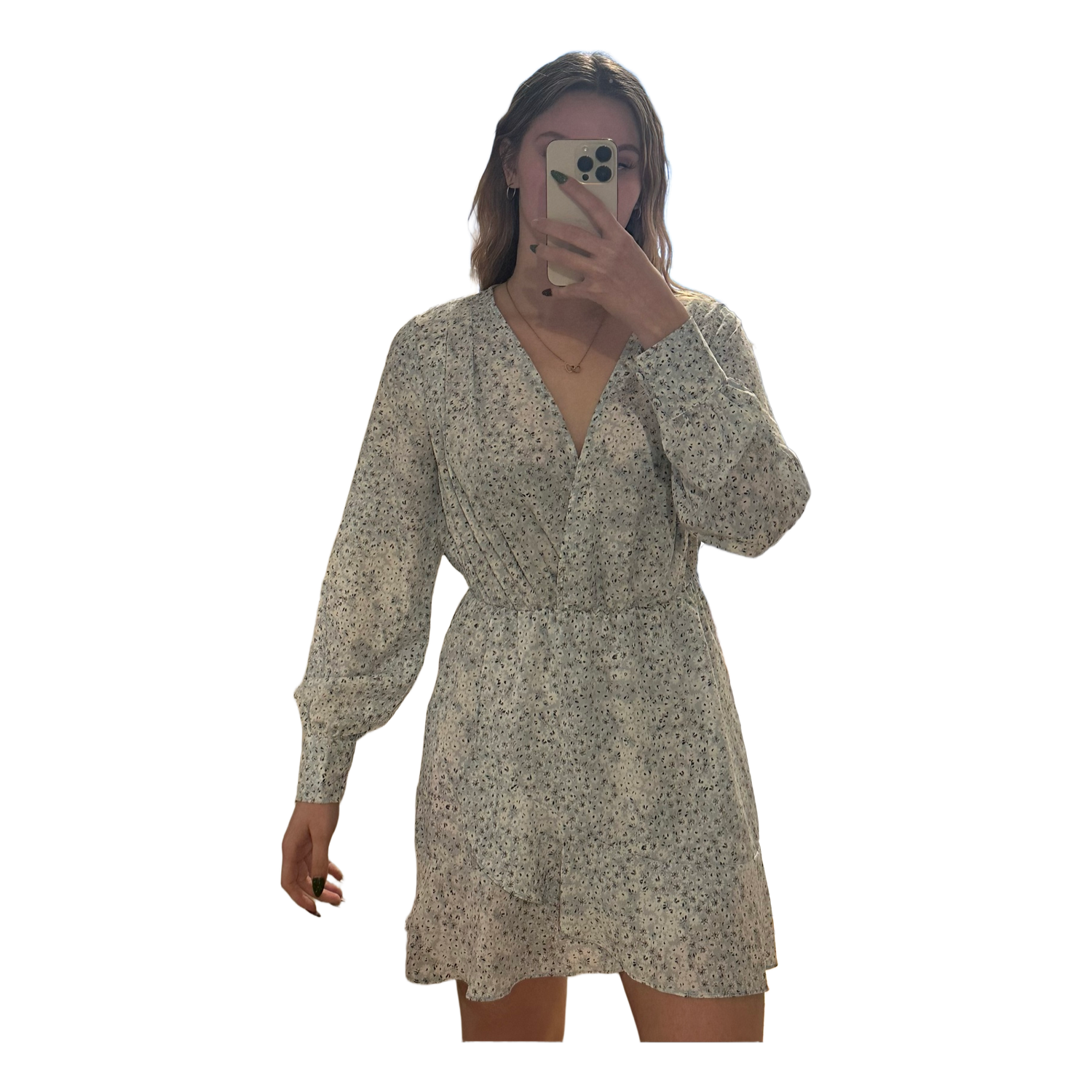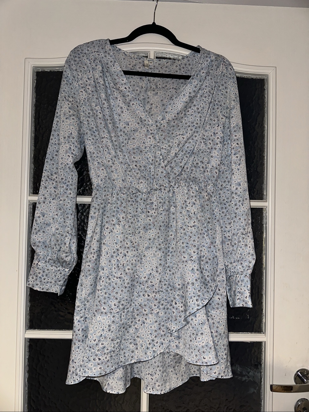 Mini dress featuring a blue floral print and a v-neckline. Long sleeves with button cuffs and a ruffled hem detail.