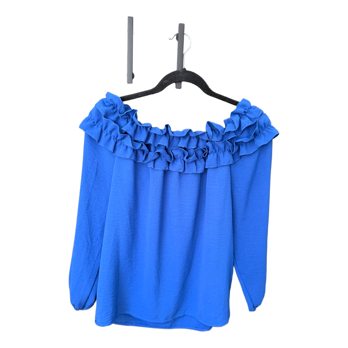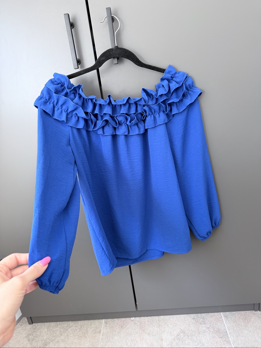 Blue blouse with long sleeves and ruffled off-shoulder neckline.