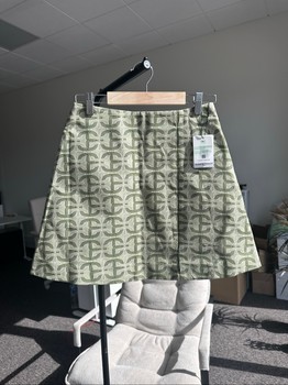 Green mini skirt featuring a geometric monogram print. Made from 100% cotton. Size 36.