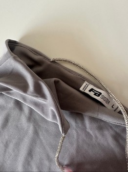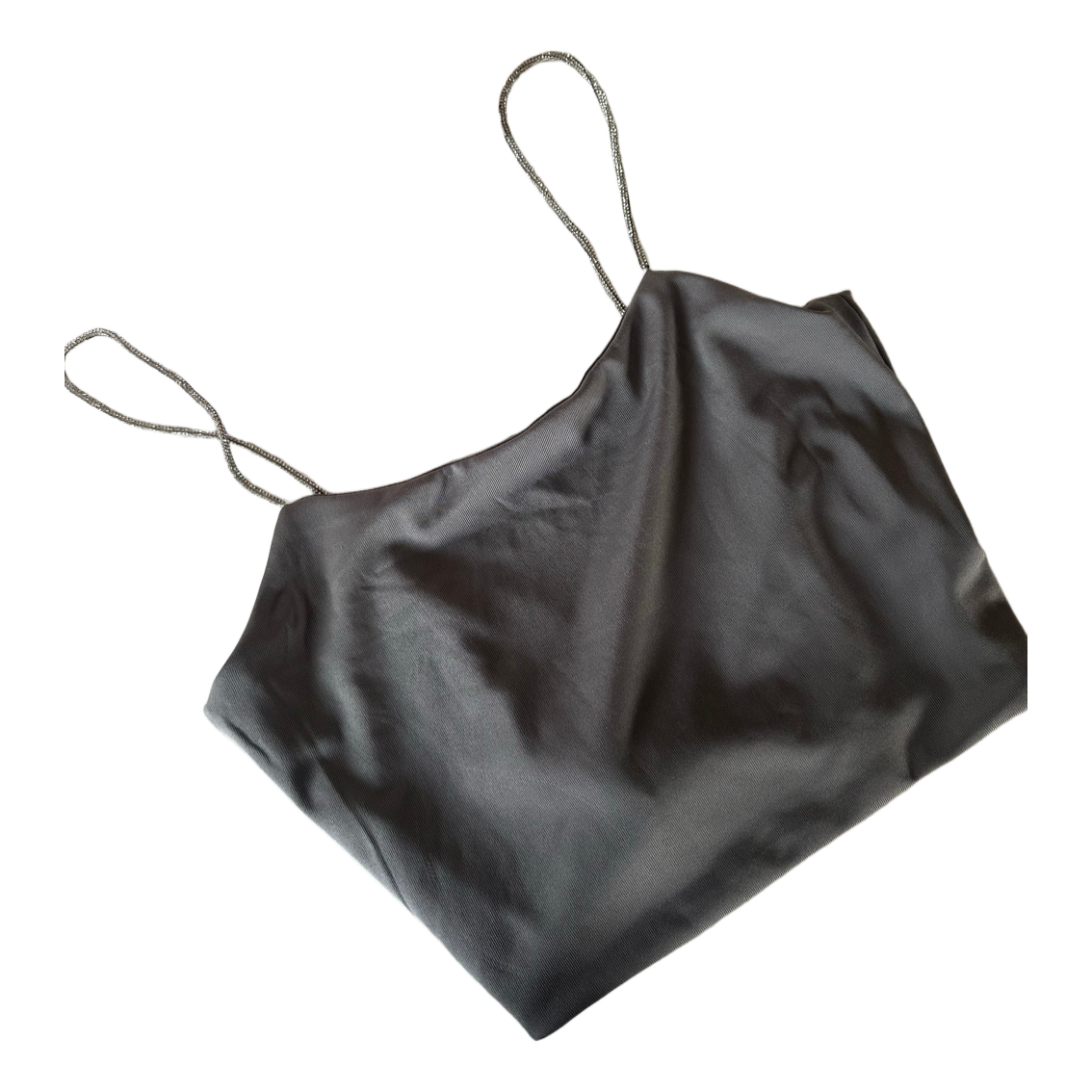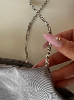 Grey top with decorative rhinestone straps. Features a cowl neckline. Size L.