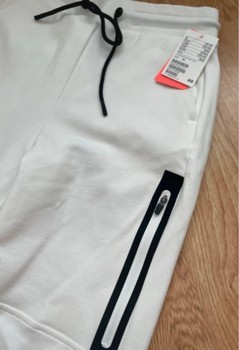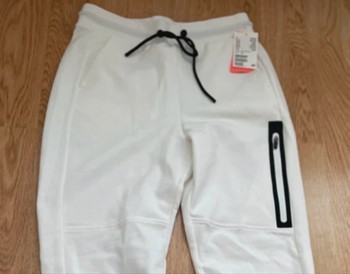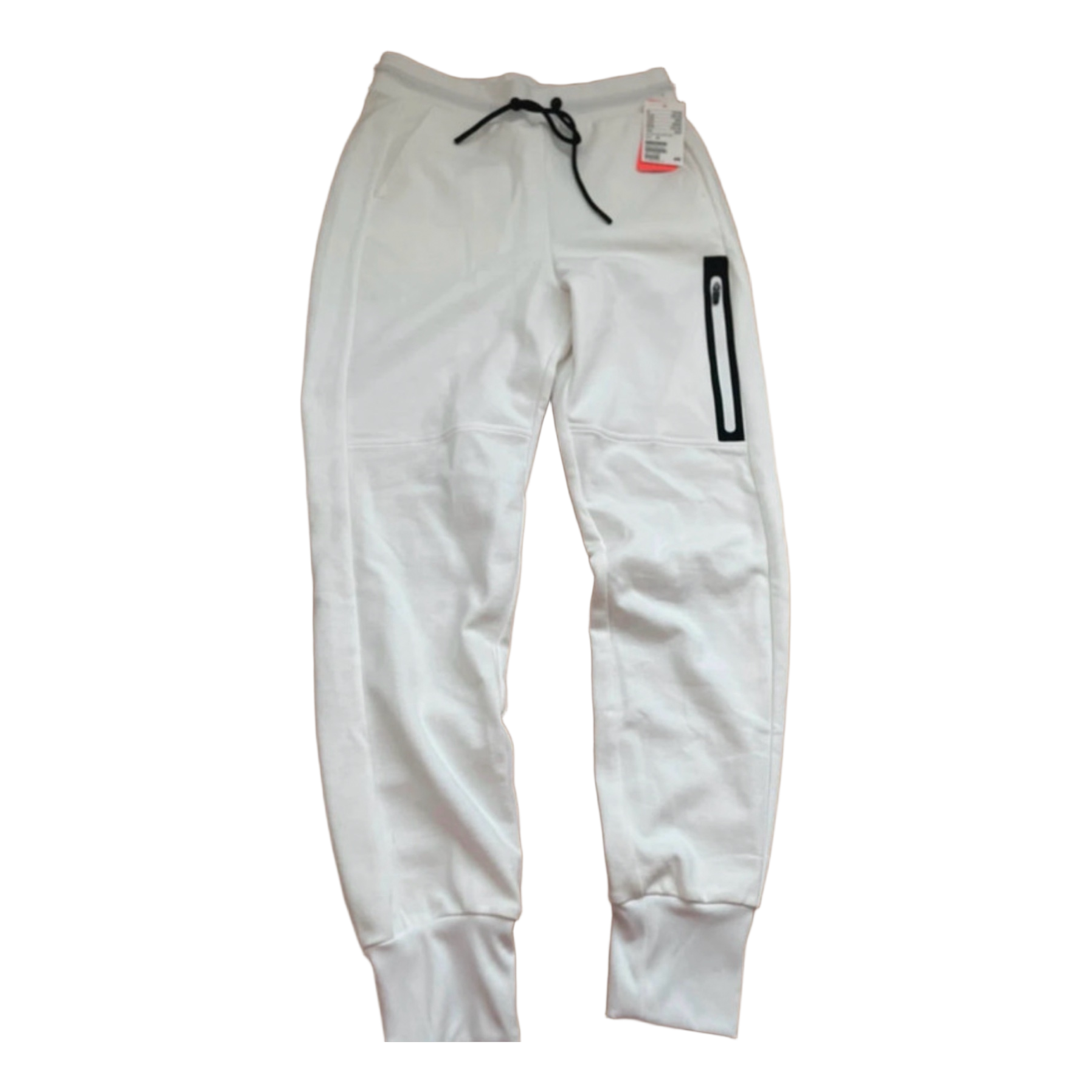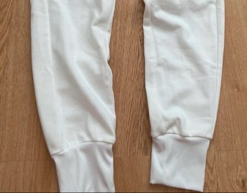 White sweatpants with zip pocket and drawstring. New, tags attached. Size XS, inseam 70 cm, relaxed fit.
