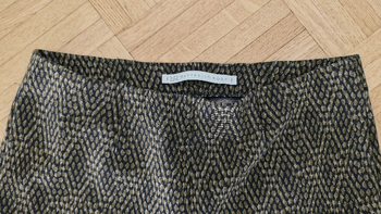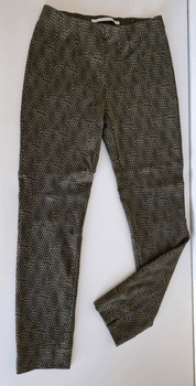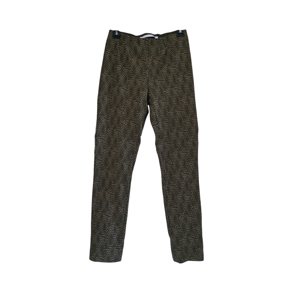 Elastic, narrow, incredibly comfortable pants. Green-black snake pattern. Horizontal seam at the back at knee level, small slits at center back. Pants look good e.g. with boots. Clean, just washed. Viscose, polyamide, elastane.