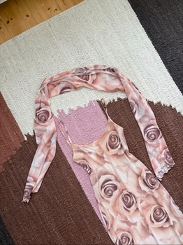 Branting brand two-piece set, which includes a dress and a small bolero 💗 Dress size M and bolero XS; but I would say that both fit about size S. Shoulder-to-hem approx 117 cm (non-adjustable straps) and armpit-to-armpit approx 39 cm. Dress stretches a little. No zipper.