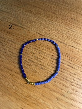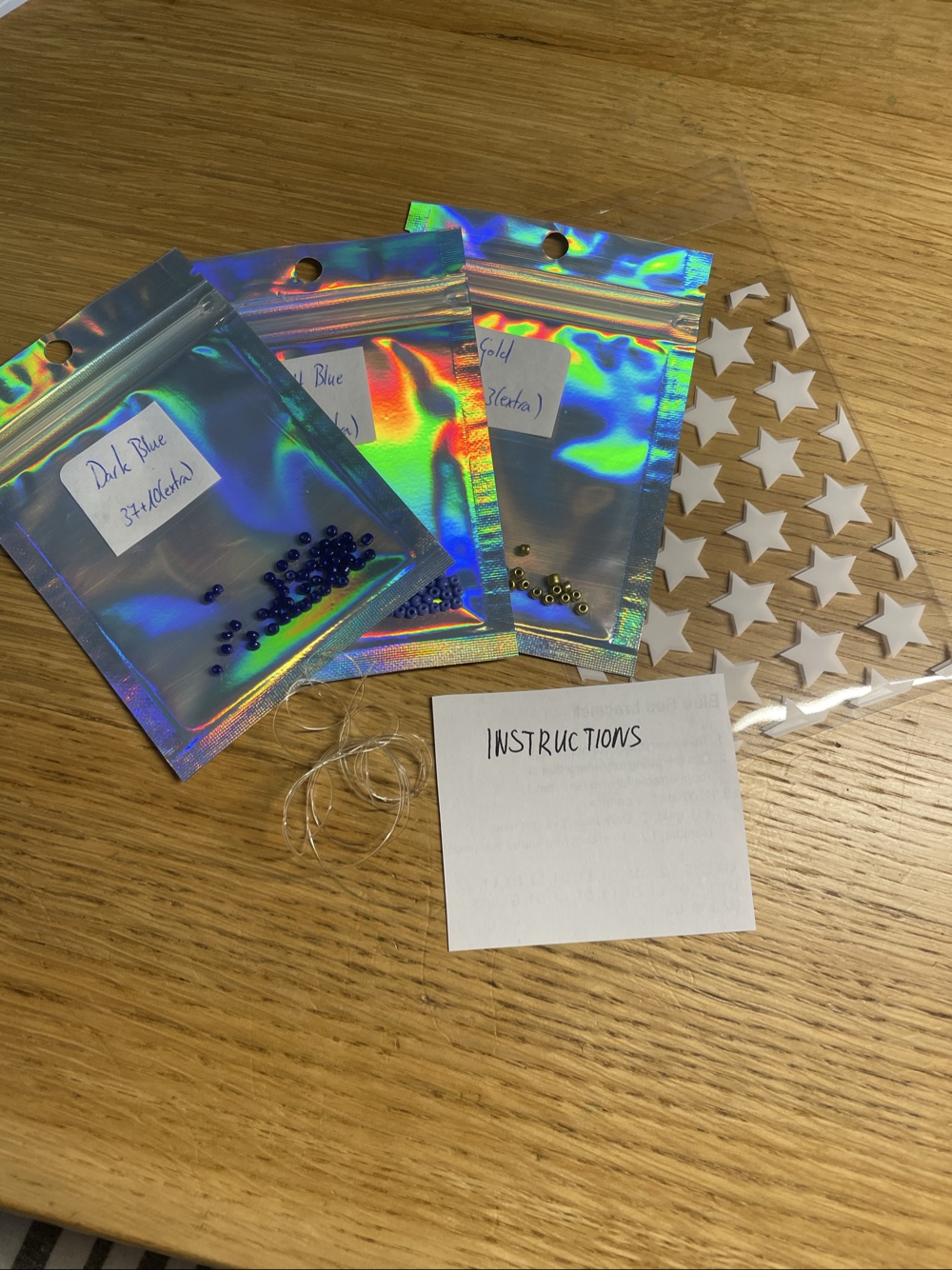 DIY bracelet kit including colorful glass beads, gold tone accents, elastic thread, and step-by-step instructions.