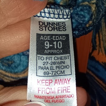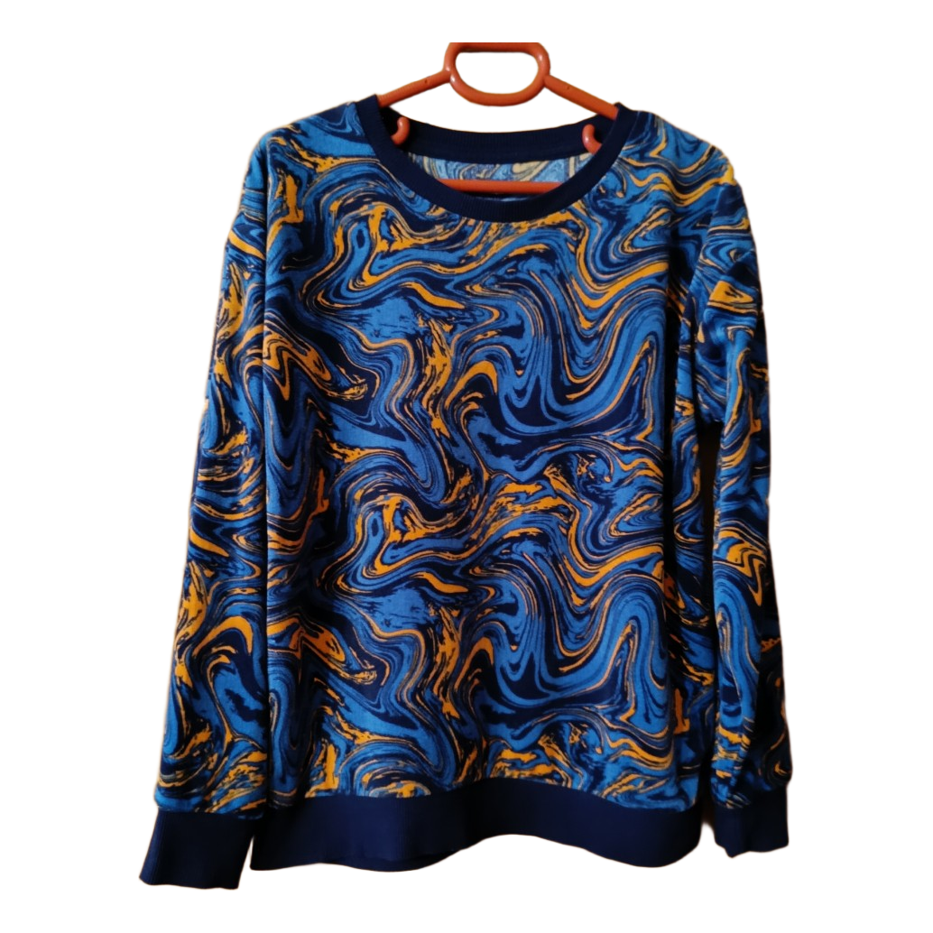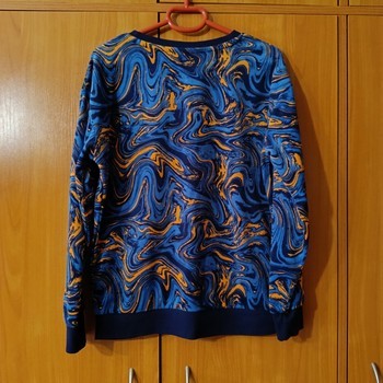 Blue and orange marbled sweatshirt. Made of 100% polyester. Size 9-10 years.