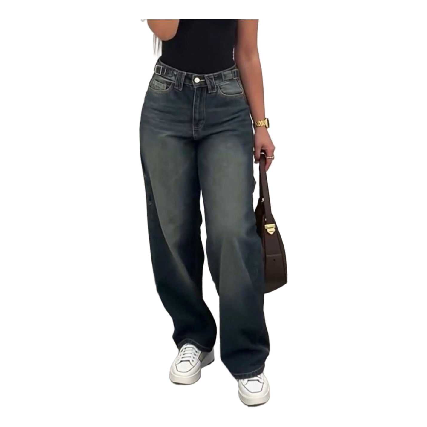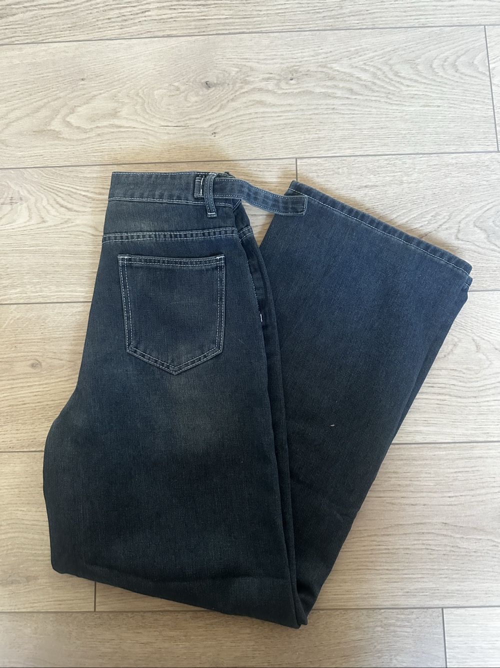 High-waisted wide leg jeans in a faded blue wash. Features a belt detail at the waist.