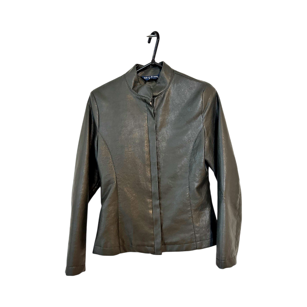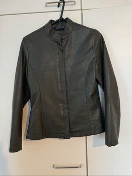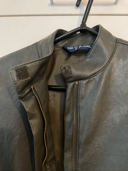 Gray leather jacket, with zipper at the front and high collar. Size M.