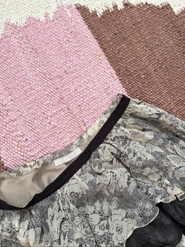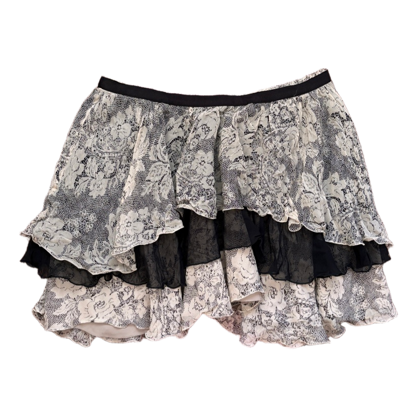 Cute layered mini skirt 💗 Brand Stefanel, size 34 but fits more like size 36. Waist width approx. 37 cm. Fabric looks like so-called lace but is silk. Hem is asymmetrical and in some parts longer than elsewhere, length approx. 35–41 cm