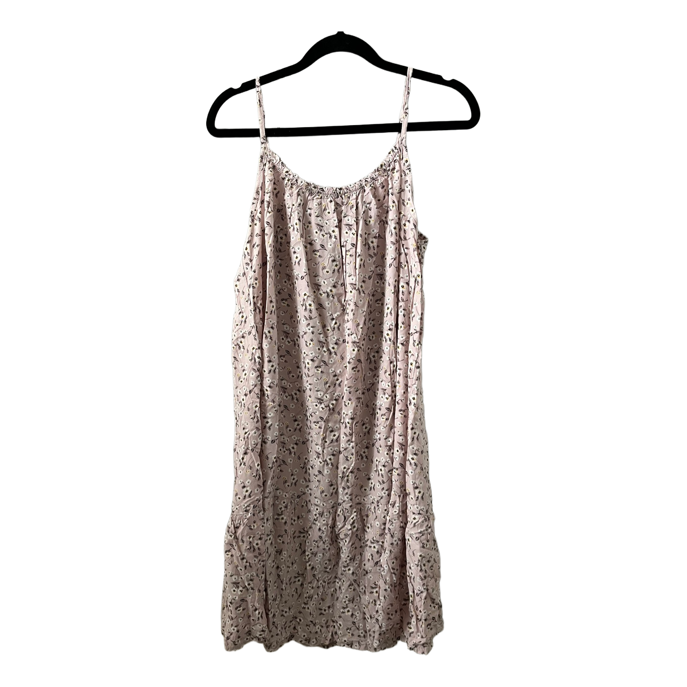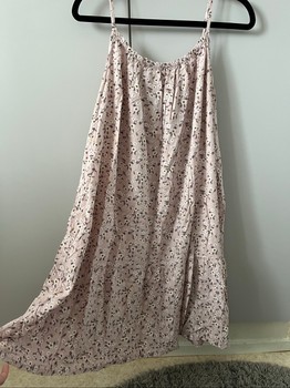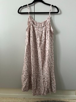 Light pink/light lilac, floral-patterned summer dress with thin shoulder straps. The dress was bought in a small clothing shop in a Greek village. Size corresponds to about XS.