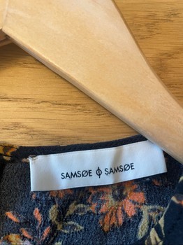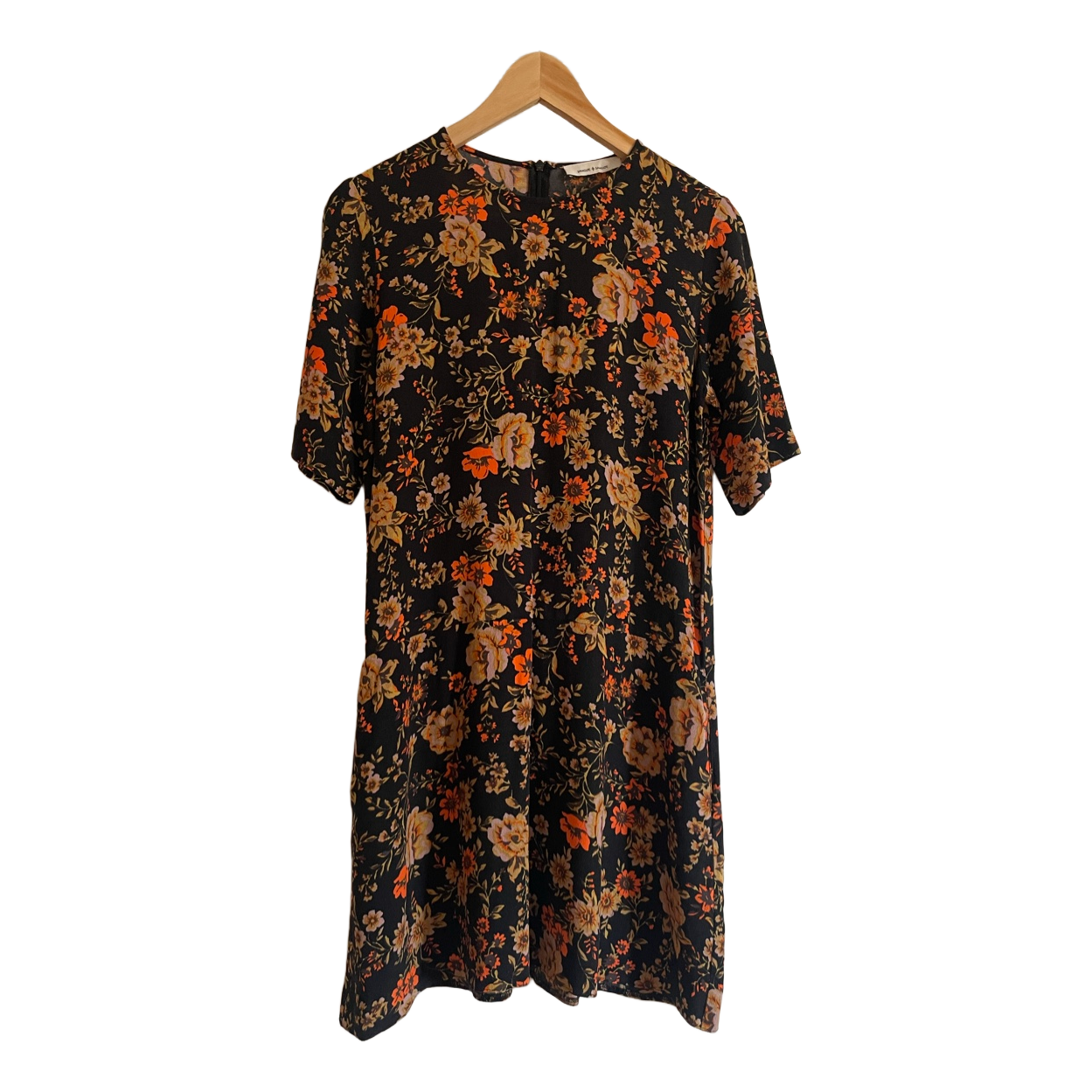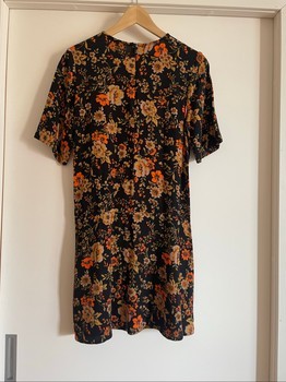 Black floral-patterned dress. Short-sleeved style with a zipper at the back. In very good condition!
