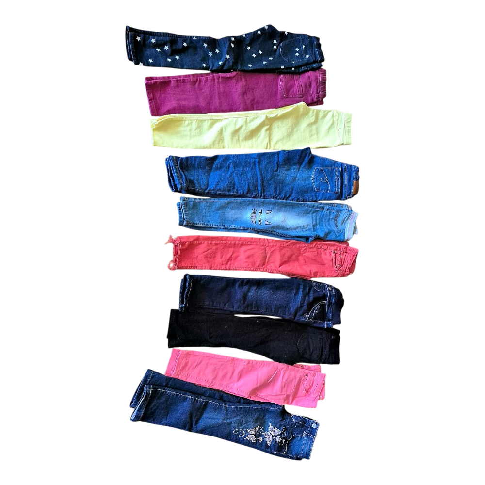 Komplekts ar bērnu biksēm dažādās krāsās un stilos. Ietver džinsus ar izšuvumiem un rakstiem. 122-128