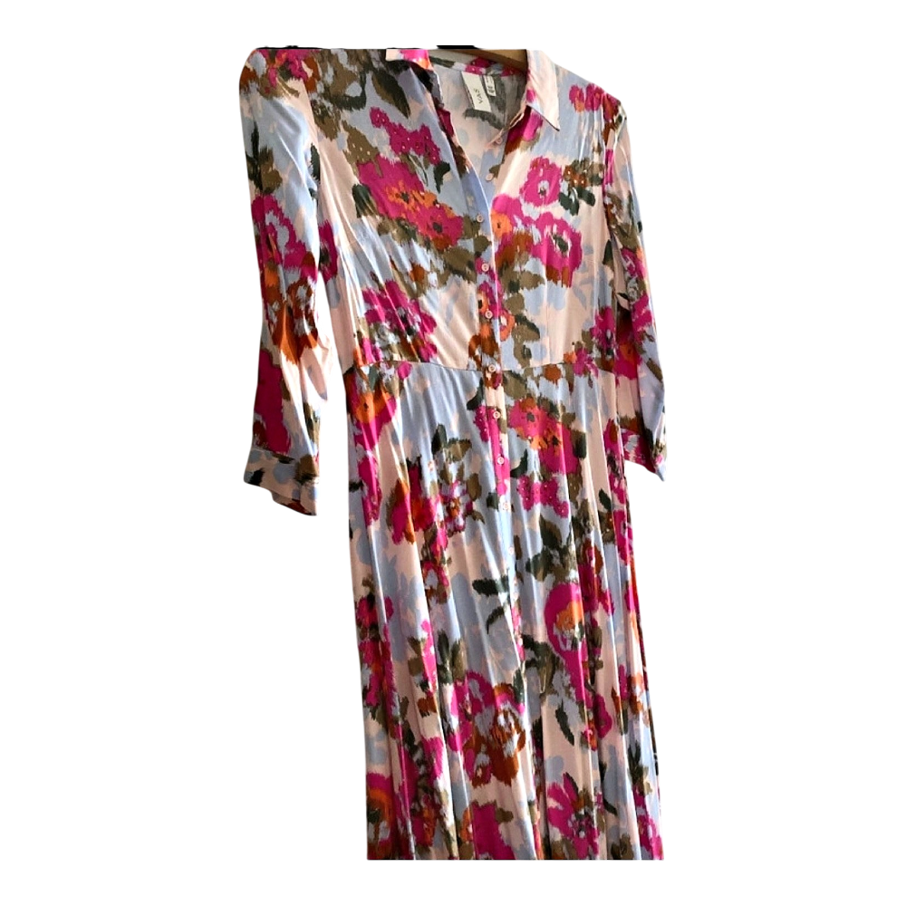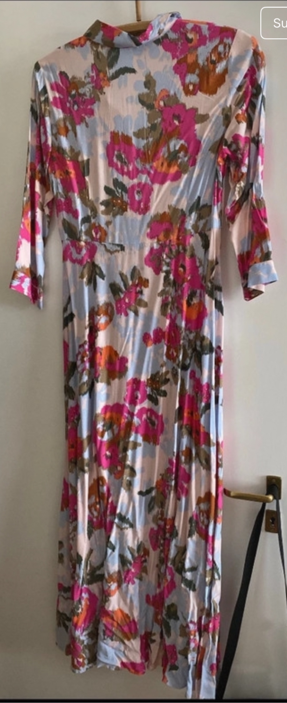 Long-sleeved, buttoned floral dress. Light background, colorful floral patterns. Lovely, worn once for a moment but a bit big for me. 3/4 sleeves. Measurements: pit-to-pit 46, waist 80, shoulder-to-hem 136