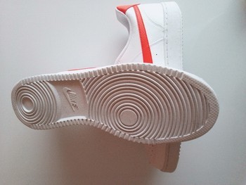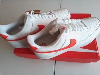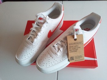 White Nike Court Vision sneakers with red swoosh. Made with at least 20 percent recycled content. Size 45.5.
