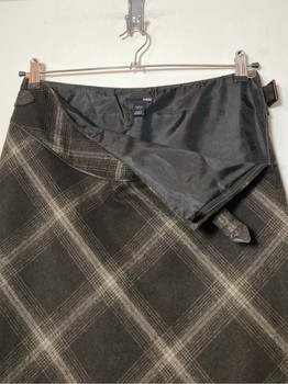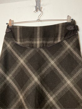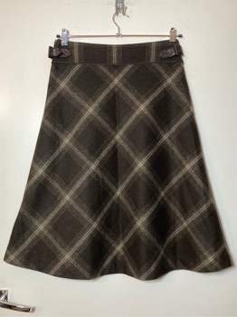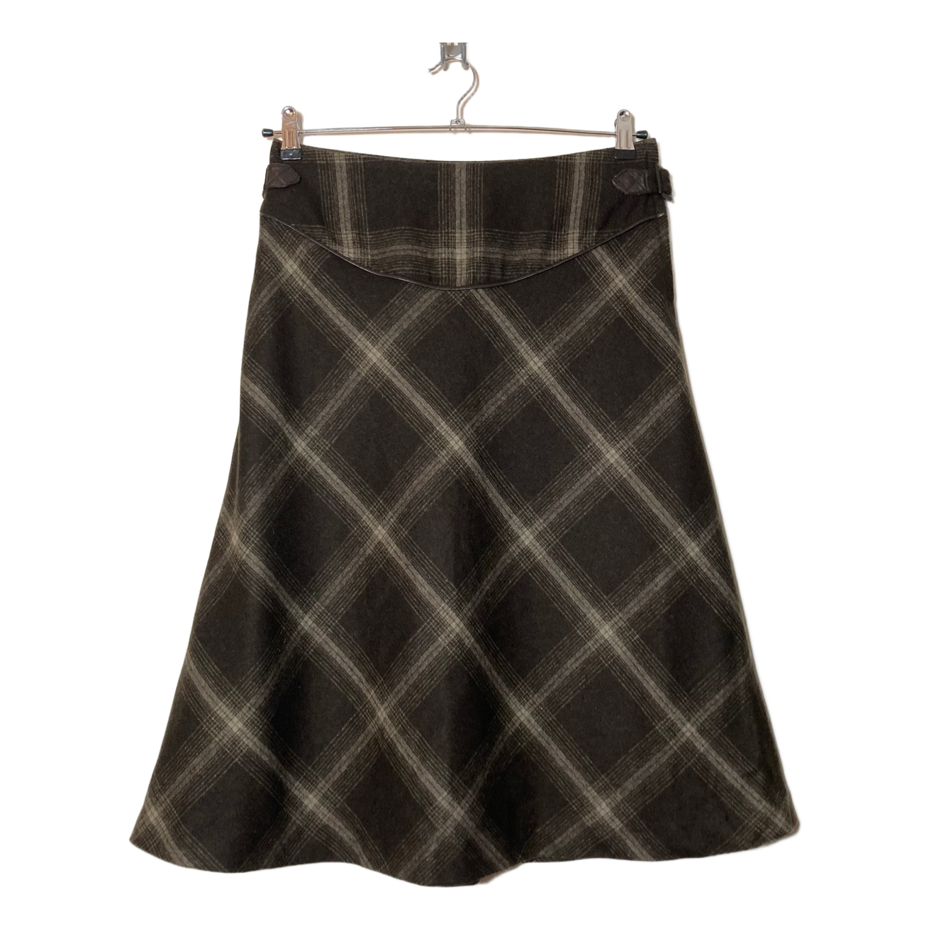 H&M brown-beige checked skirt. Full lining. On the left side zipper, button and buckle. Beautiful curved waistband with piping and buckles at the sides. Flared hem. Fabric cut on the bias. Excellent condition, small signs of wear. Shell 50% wool and 50% polyester. Lining polyester. Size 38. Waist circumference about 80 cm. Length about 73 cm.