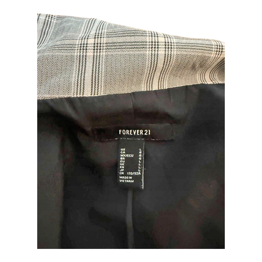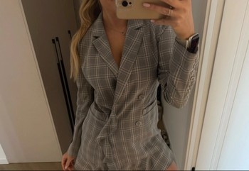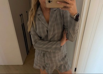 Grey plaid double-breasted blazer dress with ruffle hem detail. Long sleeves. Size L.
