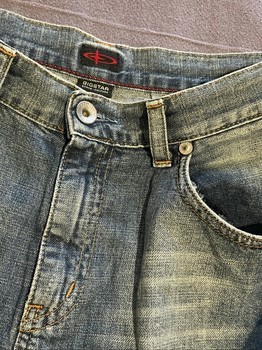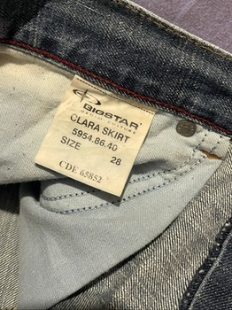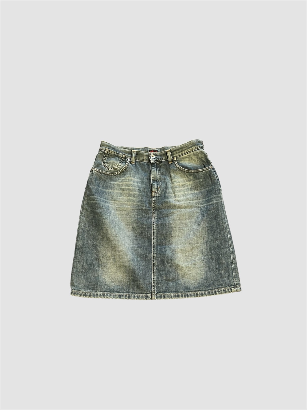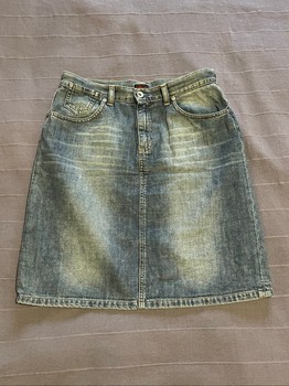 Blue denim skirt with a faded wash effect. Features front pockets and a rear slit. Size 28.