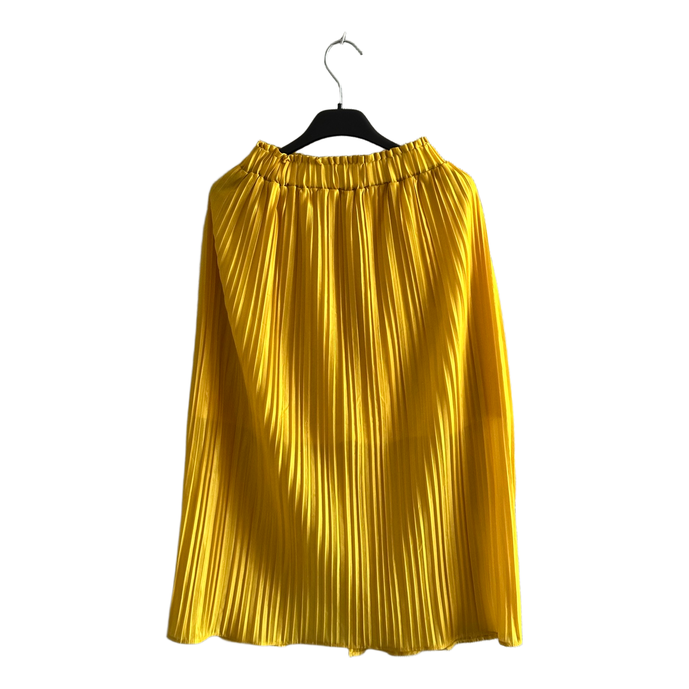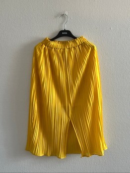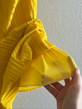 No brand yellow pleated skirt. There is a slit on the back and an under layer skirt. Not see through. Elastic waistband.