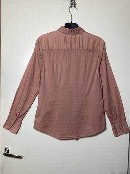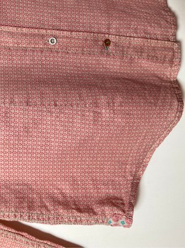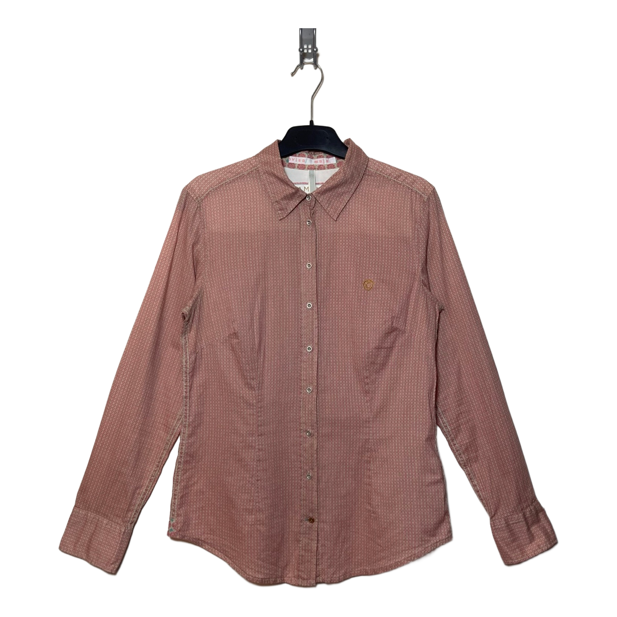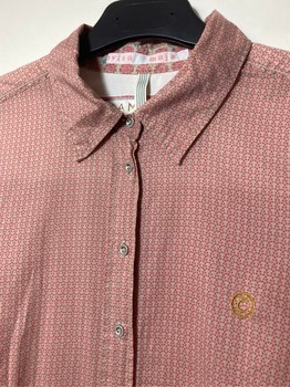Marc O’Polo high-quality reddish collared shirt. Beige base and reddish-brown pattern. Slightly lighter shade than in the pictures. Pattern has very small red petals on a beige background. Front placket with small metal buttons. Sleeve placket seams and cuffs have buttons. Decorative floral fabric on the inside of the cuffs. Floral fabric also found on the inside of the collar and in the side seam reinforcements. Yoke reinforced with white fabric. Many strong denim-style topstitches. Sewn logo on the left chest. Two spare buttons kept. Bottom button and left cuff button are brown (original buttons), others are silver-colored. Thin, high-quality and nearly transparent fine cotton. Excellent condition, small signs of wear. Size M, fitted model. Pit-to-pit measurement about 48 cm. Waist circumference about 42 cm. Length about 67 cm. Pickup possible from Helsinki. Also listed elsewhere.