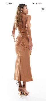 Beige midi dress with a cowl neckline and a metallic detail on the shoulder. Pleated waist and back.