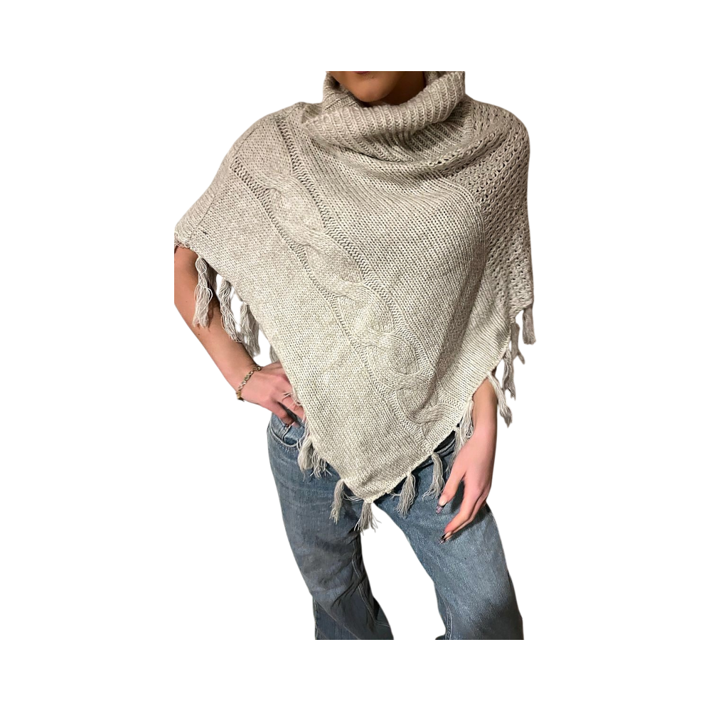 Light poncho with a high collar and large armholes. Details include twisted cables and fringes. Suits well for layering.