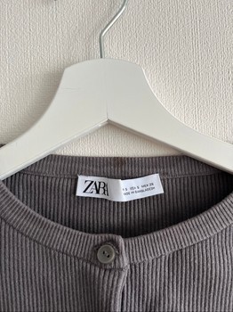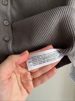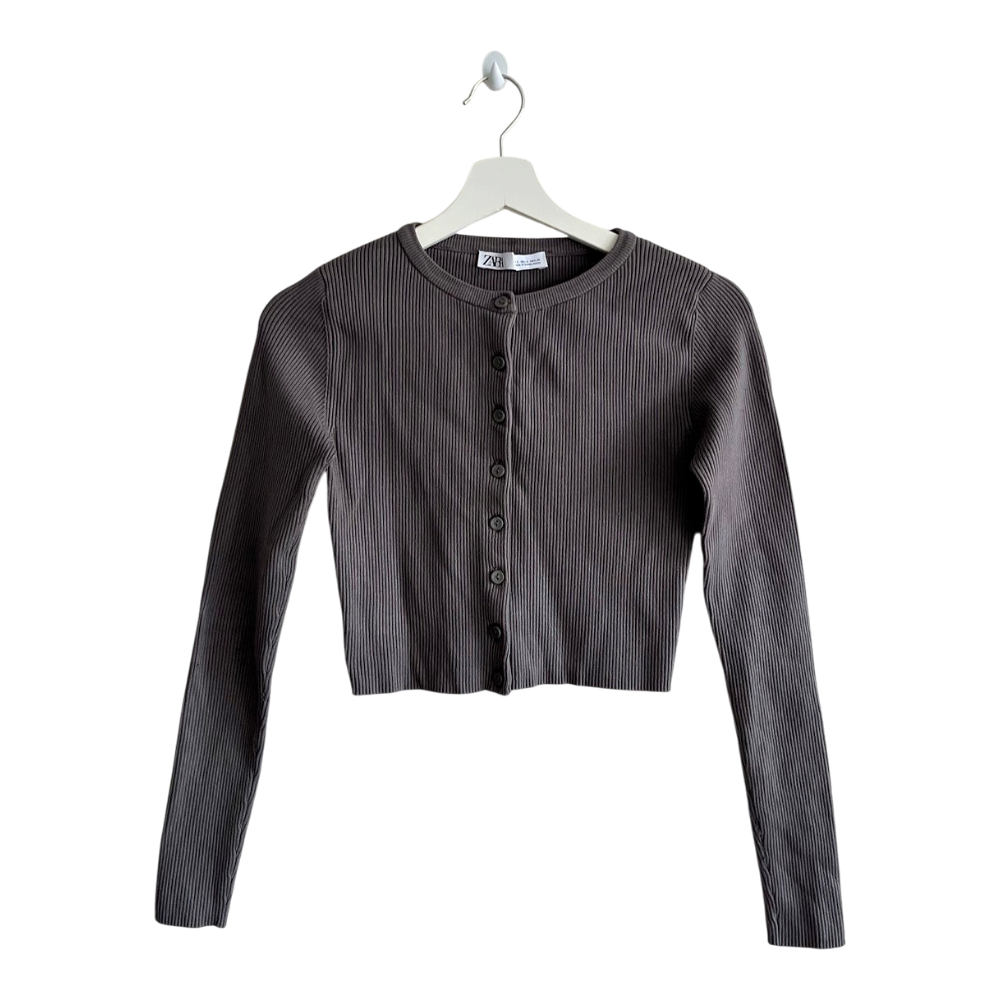 Button-down ribbed cardigan in a grey tone. Features a round neckline and long sleeves. Size S.
