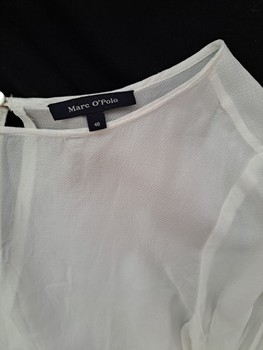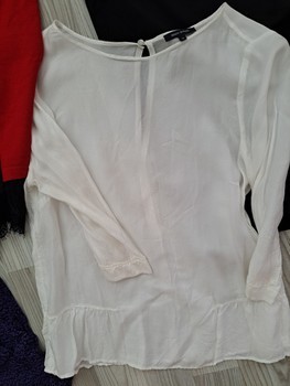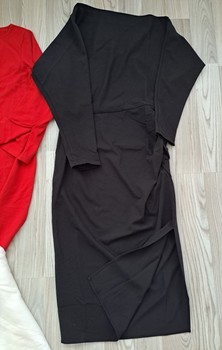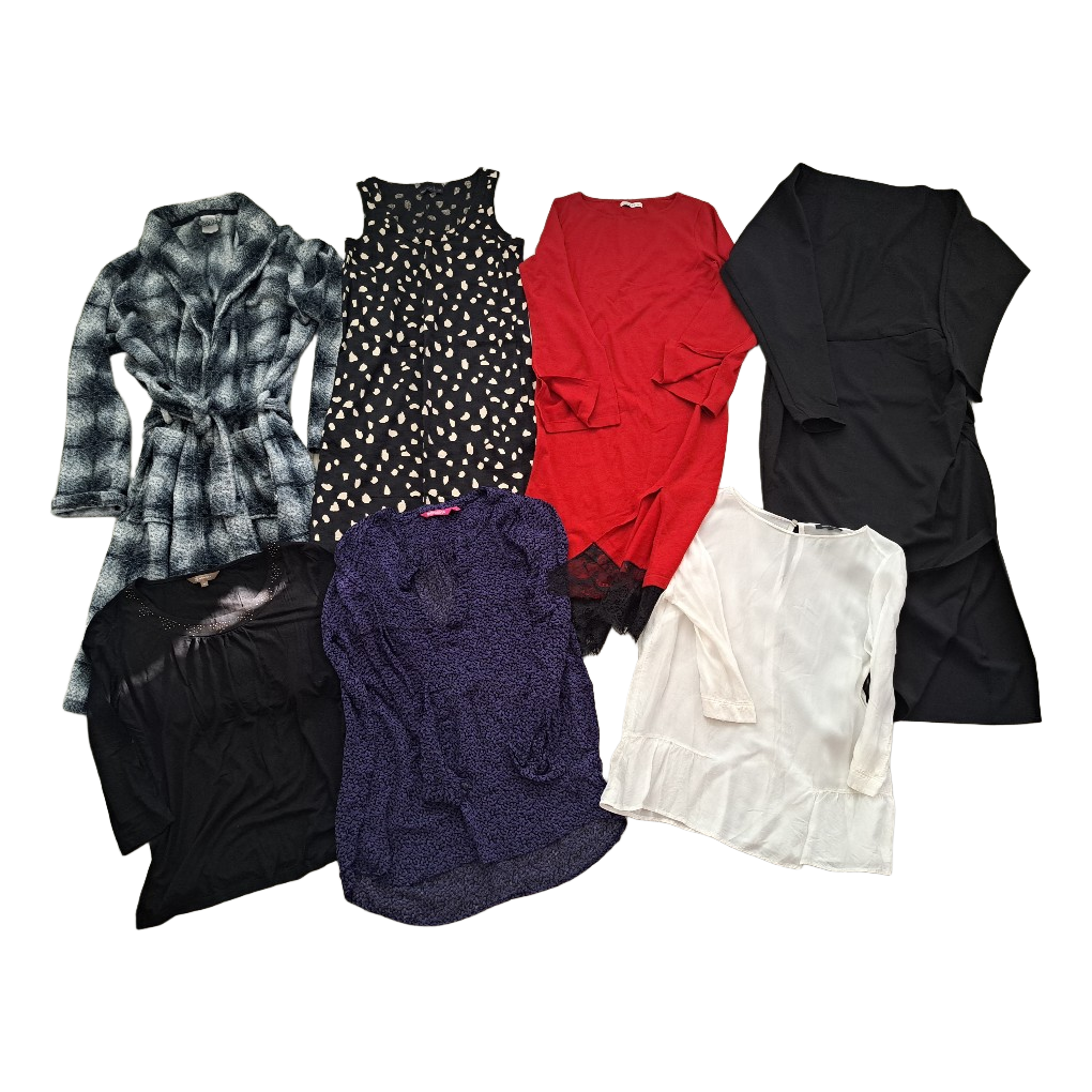 Most of the clothes are new. New clothes: black H&M dress, red knit dress mint&Barry, M&S linen dress, washed once. Worn a couple of times: Indiska blue-black shirt, Marco'Polo white shirt, black Adventura shirt. Bathrobe used more, good condition, intact.