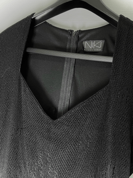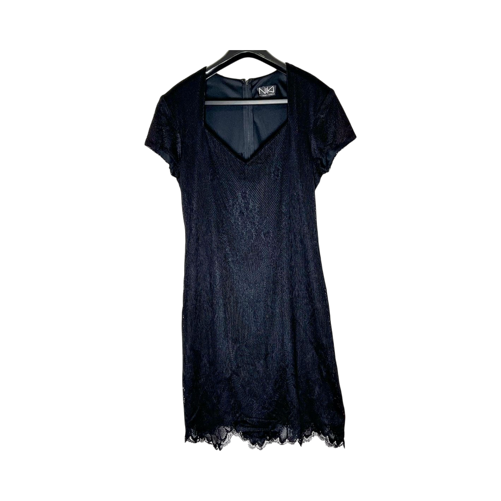 Like-new stretchy lace NiKi little black dress. Lovely to wear, beautifully accentuates feminine features, beautiful neckline. Size/material/wash-care labels removed, but I would guess the outer lace is maybe polyester and the inner soft stretchy fabric maybe polyester + elastane (?). Washed by hand. Length nape seam to hem 100 cm, shoulder width 45 cm, width at underarm 51 cm (stretches to 60 cm), waist width 43 cm (stretches to 54 cm), hem width 54 cm. 55 cm zipper from nape to top of the rear.