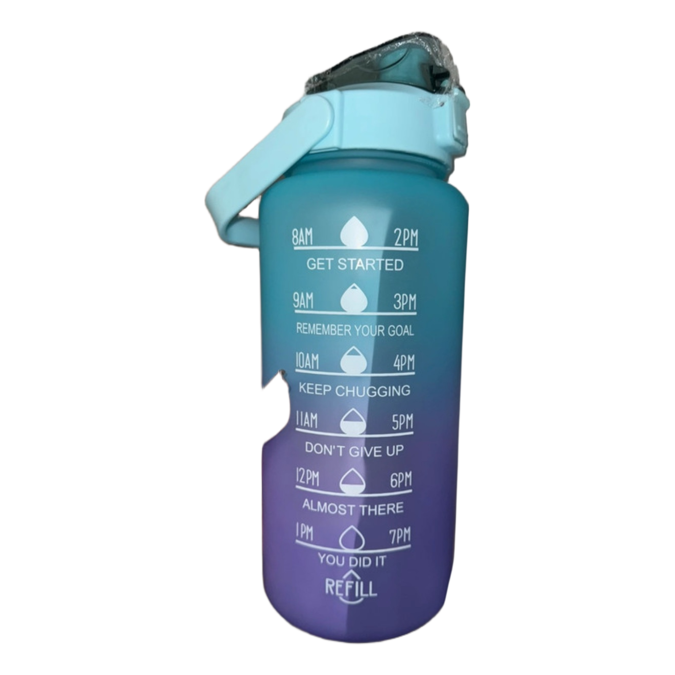 Gradient water bottle with time markings. Made of plastic.