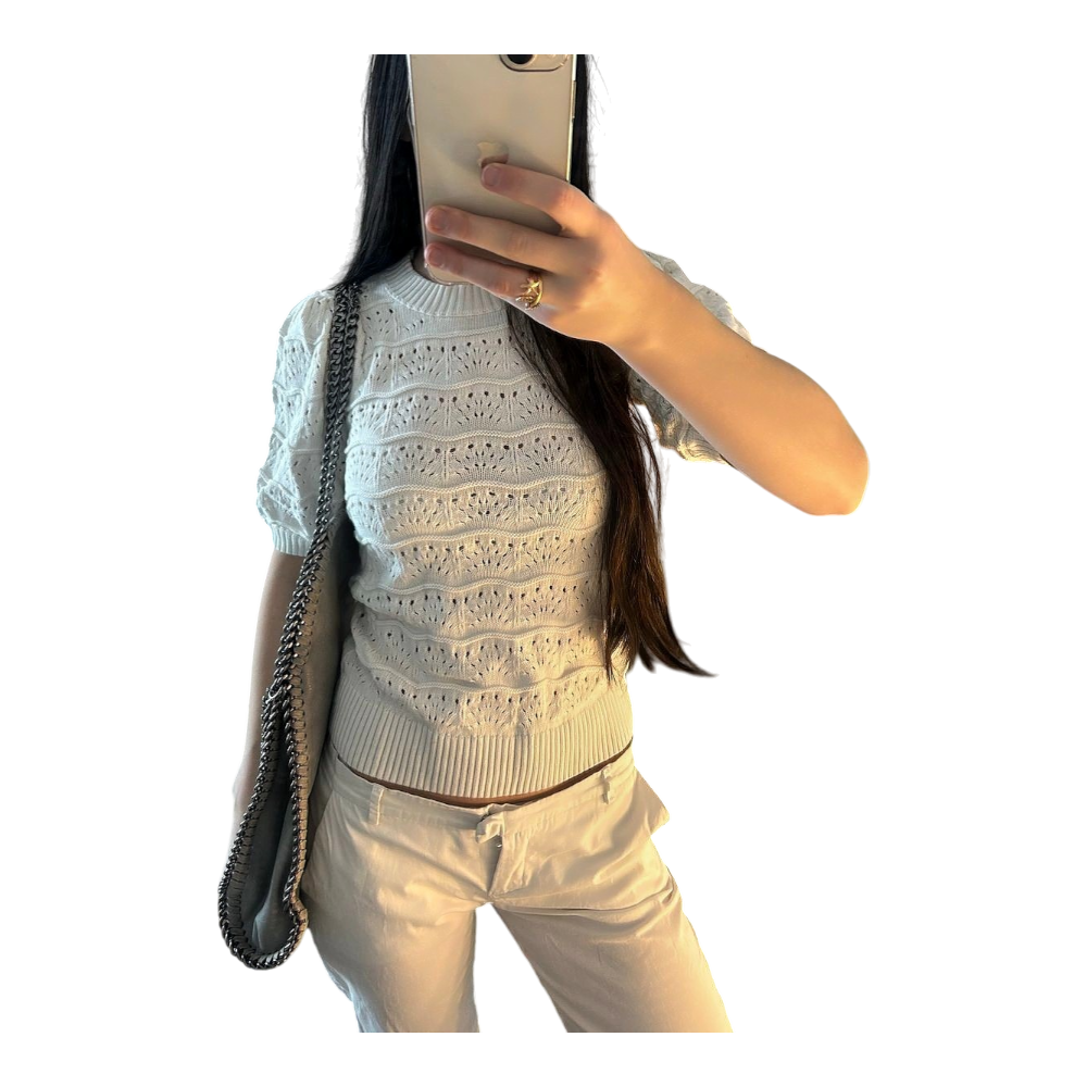 White short-sleeved lace knit top. Made of knit. Size XS.
