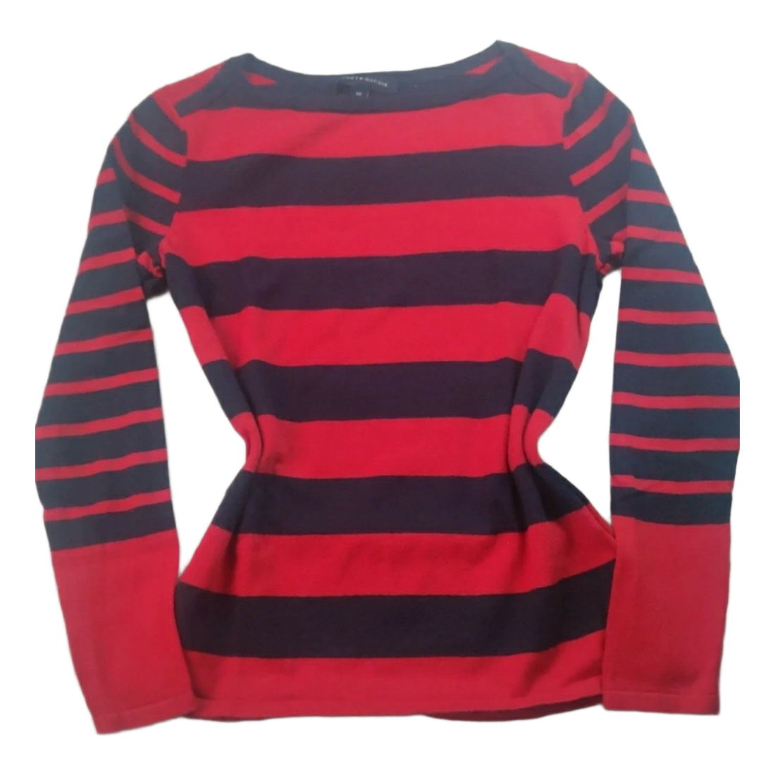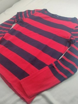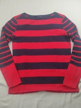 Women's long-sleeved shirt with dark blue and red stripes. The red color is not quite as bright in person as in the photos.