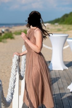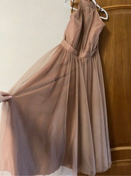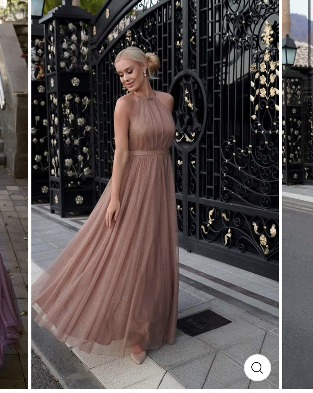 Elegant brown floor-length dress with a subtle glitter finish. Featuring a halter neckline and a fitted waist. Size 34.