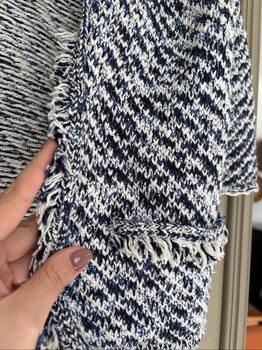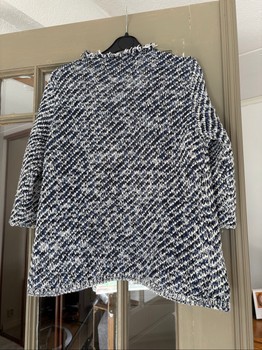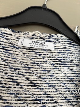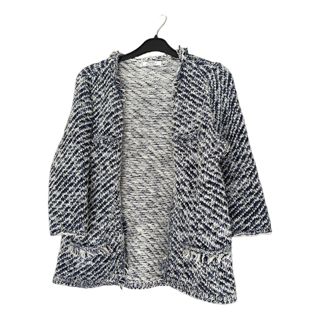 Mango's blue-and-white, thick cardigan. Fringe decorations on the lapels and also at the front by the pocket area. Somewhat heavy (probably) cotton material. Good condition, nothing to complain about. Size S.