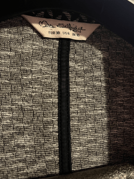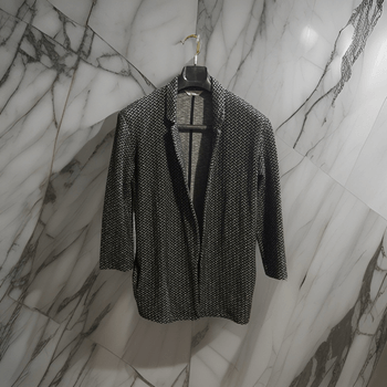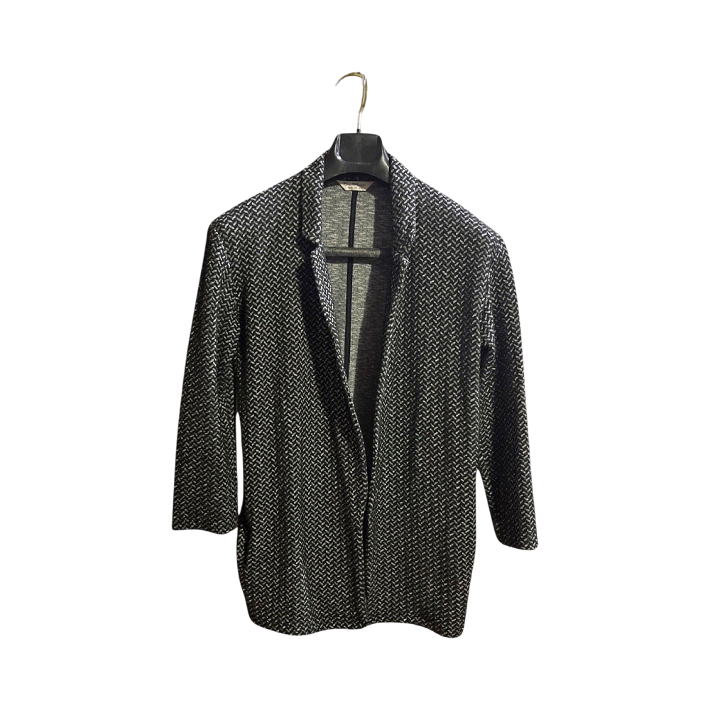 Blazer featuring a black and white color with an open front design. Includes three-quarter sleeves and a textured pattern.