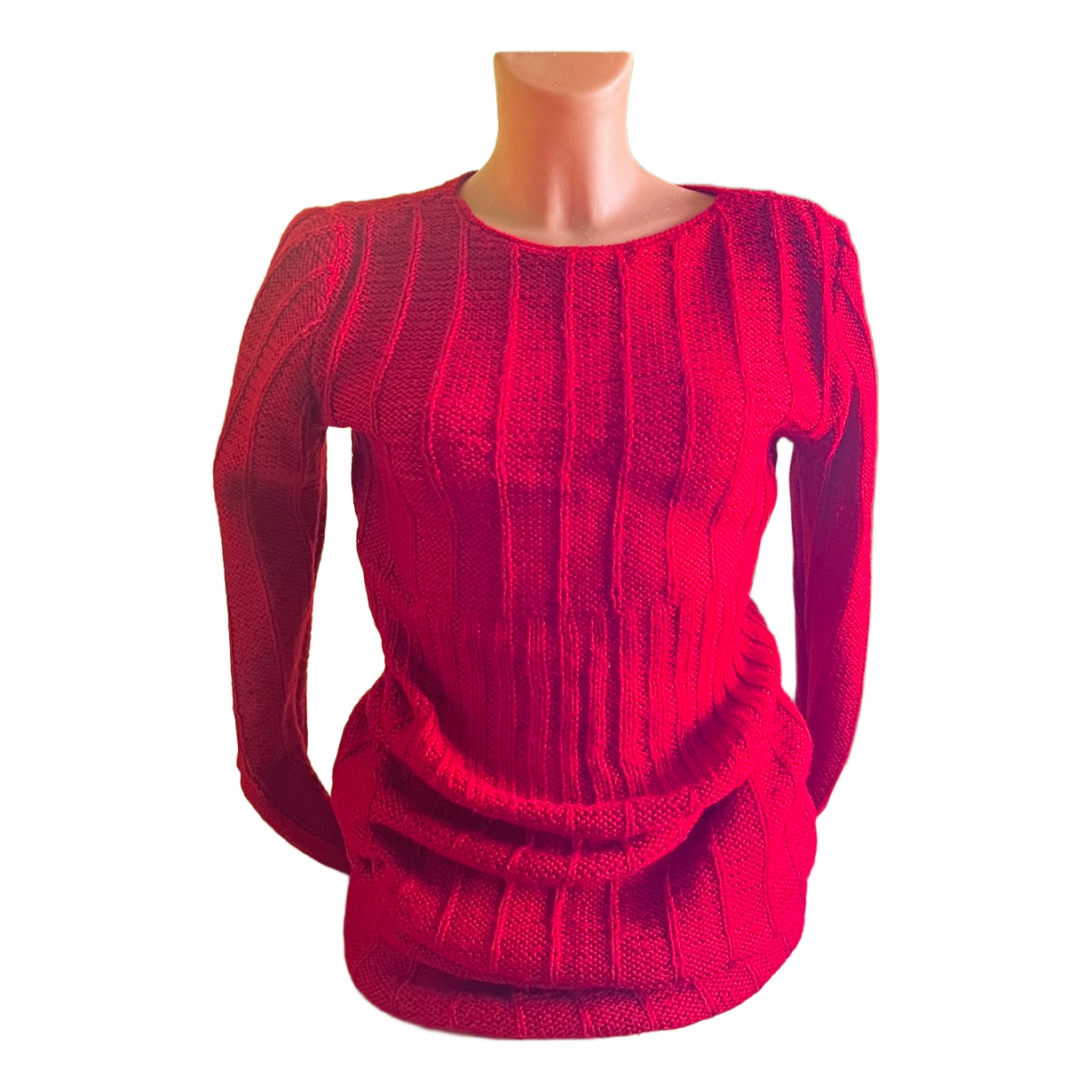 Red ribbed knit sweater with long sleeves and a round neckline.