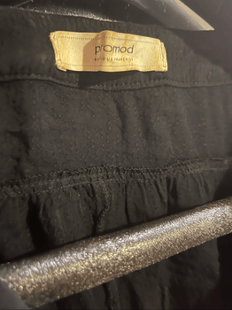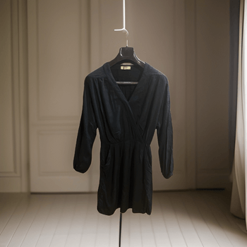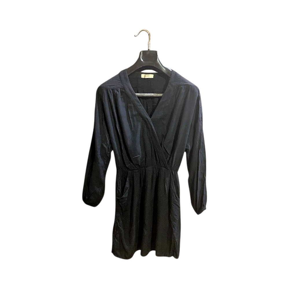 Dress featuring a black color with a wrap design and long sleeves. Includes a tie waist and pockets.